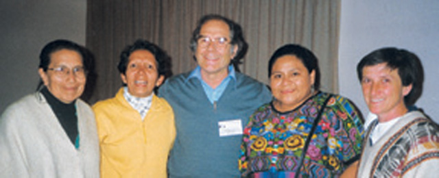 The “two Julias” mentioned in this article are Scarboro lay missioner Julia Duarte (second from left) and Julia Serrano (far right). The others are Stella Gutierrez, a Colombian theologian, Perez Esquivel and Rigoberta Menchu, both Nobel Prize recipients. Taken at the gathering of bishops, pastoral agents and friends of Bishop Leonidas Proano at the tenth anniversary of his death, Riobamba, Ecuador, 1998.