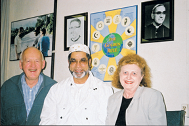 At the Golden Rule poster launch: L-R: Fr. Gerald Curry, Editor of Scarboro Missions magazine; Muhammad Shaikh, a Muslim educator; and Lou Boswell of St. Joseph Thorn Press, art consultants and printer of the poster.