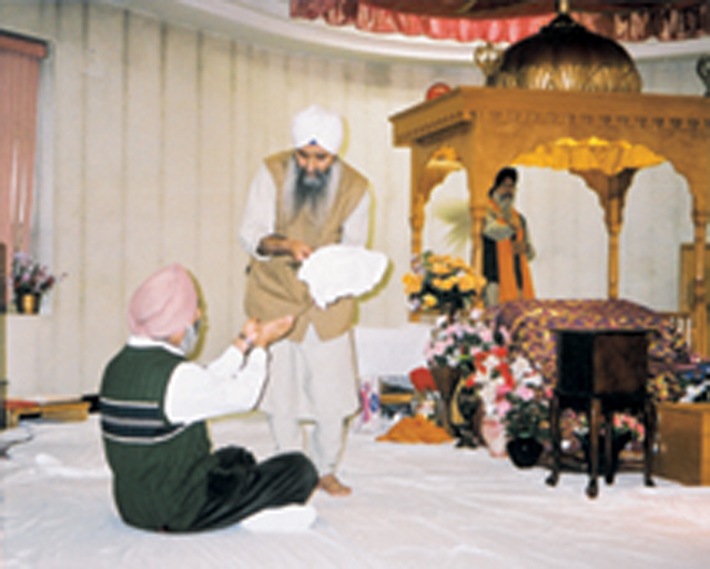 The prashaad ritual. Prashaad (meaning “grace”) is a food dispensed to the Sikh congregation as they sit with their hands cupped together to receive it. Made of sugar, flour, butter and water, the prashaad is chanted over while it is being prepared. The chant is meant to sancitify this special food. The prashaad symbolizes God’s sweetness and goodness. At the interfaith event last fall, all members of the visiting mission group were invited to partake of the sacred food.