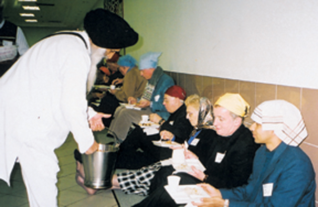 Guests at the Sikh temple are treated to a community meal (langar). Each day, every Sikh temple provides a free meal to visitors. Sikh or non-Sikh. In the dining room, people sit on the floor in rows facing one another. “We sit like this because it is like the family getting together. When you eat together, you understand each other,” said Piara Singh Minhas, a member of the temple.