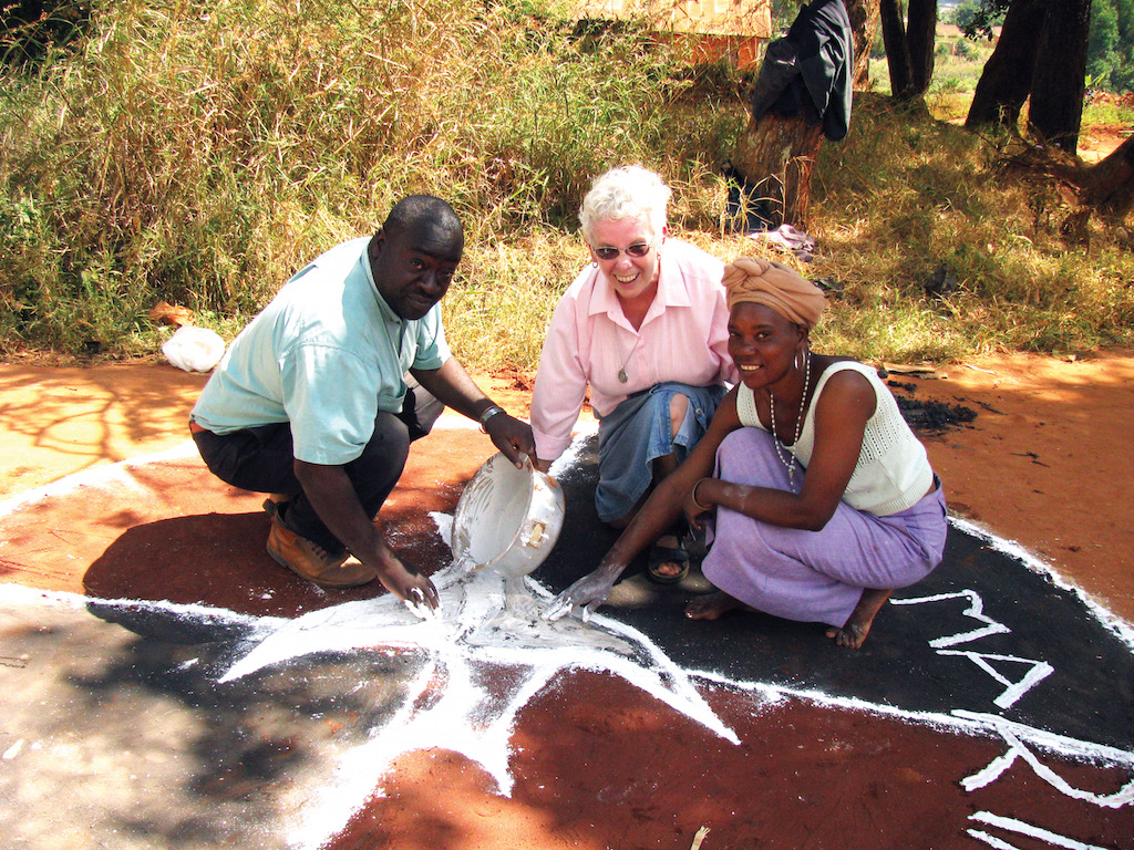 Scarboro missioner Sr. Ann MacDonald, and John and Trinitas, together with other members of the St. Maria Goretti faith community in Mzuzu, Malawi, use a paste to create circular symbolic houses and a path around the cathedral grounds. The bishop walked the path during the Feast of Corpus Christi in a symbolic gesture of carrying the Blessed Sacrament from house to house.