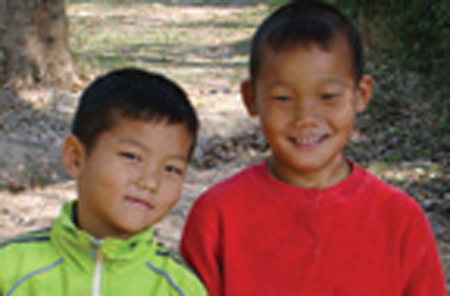 Chawalit the tree climber (in red) and his friend Bunmee, students at Nuchanat Anusorn School, Thailand.