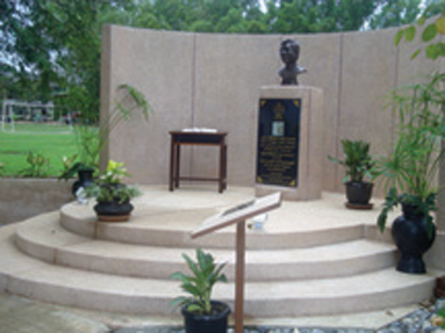 Looking north down the walkway from Nuchanat Anusorn School, on the left directly opposite the statue of Mary, is a monument to Fr. Komkrit Anamnat and a memorial garden housing many of Fr. Komkrit’s favorite plants. I am grateful for the honour of having been asked to design and oversee the construction of these areas. A large tamarind tree laden with fruit stands between the statue and the monument. In the foreground is the priests’ rectory, and the boys’ dormitory is to the right.