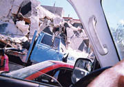 Day 2, January 13: ...None of us yet knew the dimensions of the quake. When we made our way into the heart of Port-au-Prince haltingly, stopped by piles of rubble and having to turn back and try another artery, seeing the bodies lined along the side of the street and people searching for the faces of loved ones, it began to dawn on us and we wondered what we would find when we arrived at our homes. We drove into the yard of College Marie-Anne where I lived. All was rubble. Our residence was crumbled with the contents spilling down amid twisted iron and plaster as if some huge hand had crushed it. I stood there in awe, realizing I had been spared. The yard was filling up with homeless and injured people, moth-ers and children, neighbours. News of casualties and deaths began to trickle in from the streets...