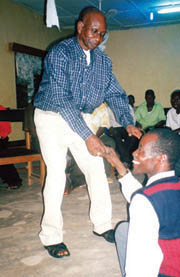 (Credit: Suzanne Marshall, O.L.M.)Theodore dances with Iorshee, a paraplegic, at a party celebrating Theodore’s retirement after 40 years of service to the St. Joseph Rehab Centre and to Our Lady’s Missionaries in ministry there. Nigeria.