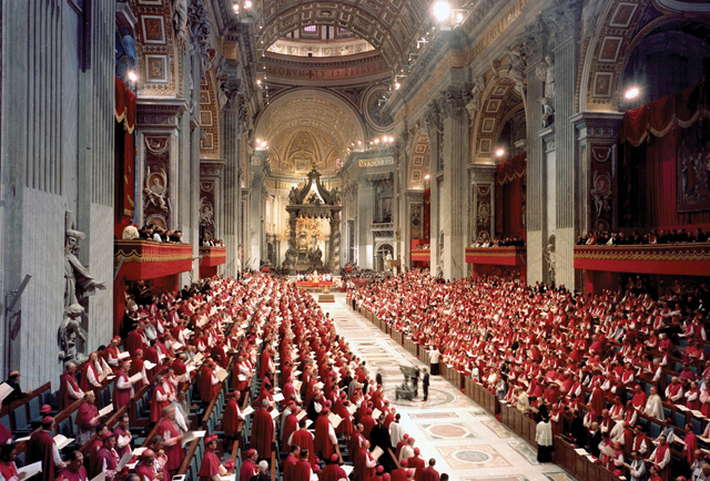 CREDIT: (CNS photo from Catholic Press Photo)Bishops fill St. Peter’s Basilica as Pope Paul VI presides over a meeting of the Second Vatican Council. Sessions were held in the later months of 1962, 1963, 1964 and 1965. Pope John XXIII opened the council in 1962, stating that the goal of the council was to eradicate seeds of discord and to promote peace and unity among humankind. The remaining three sessions were led by Pope Paul following the death of Pope John in June 1963.
