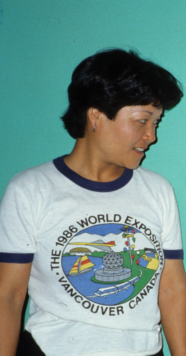 Michiko Ohashi, Japan’s first lay missioner to Peru, stands beside a poster of Fr. Bill Schultz. El Progreso, Peru. First missioned to Japan where he served more than 30 years, Fr. Bill founded a Japanese lay missionary program through which Catholics from Japan could serve in mission.