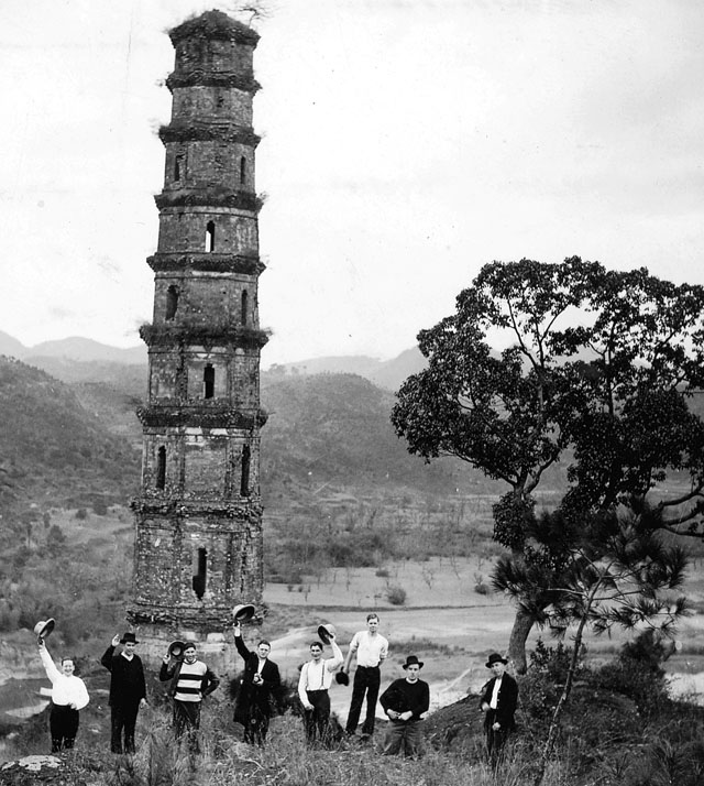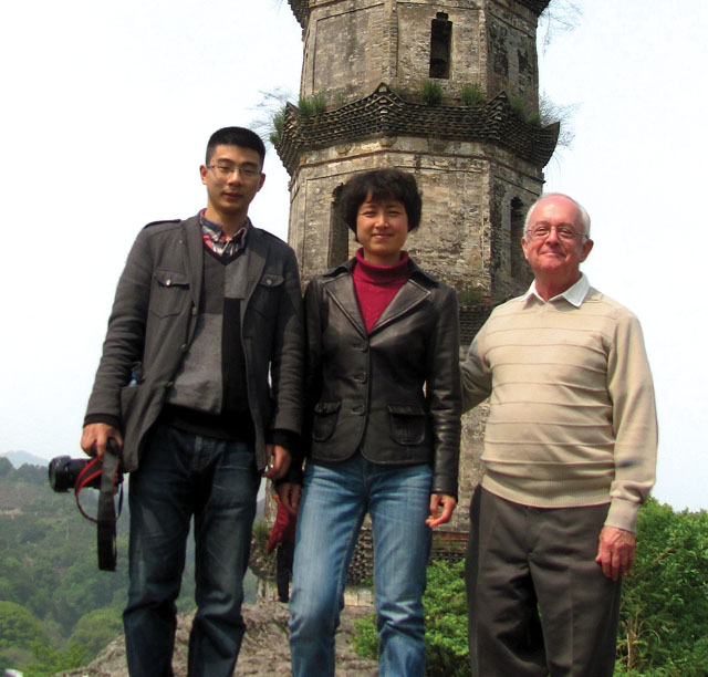 L-R: Historian Zhou Lu, English professor Renying and Fr. Mike Traher at the Lishui pagoda, the same pagoda as shown on the facing page. In the 1930s the first wave of Scarboro missionaries arrived in the city of Lishui (formerly Chuchow prefecture) in the province of Chekiang (Zhejiang), China. Fr. Mike writes, “Perhaps a thousand years old, this ancient landmark is perched on top of a large hill overlooking the Lishui River where the river divides into two branches. When returning from their mission stations, the early Scarboro missionaries looked for the familiar pagoda to know that they were almost home.”