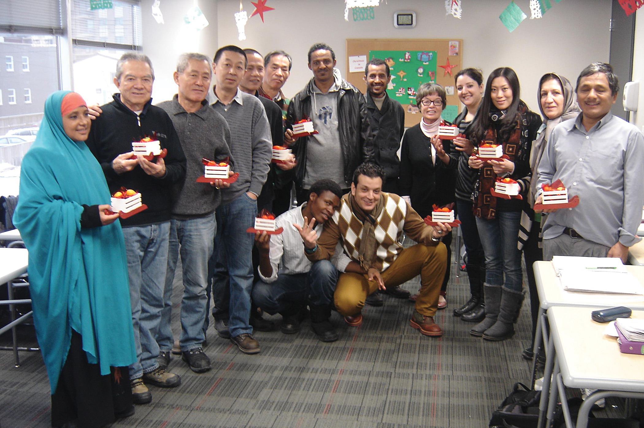Beverley at Christmastime with her students from Ethiopia, Eritrea, South Korea, China, Congo, Libya, Afghanistan, Iran, Columbia, and Burma who are learning English. Her husband, Ray, made the sleighs that are filled with candy.