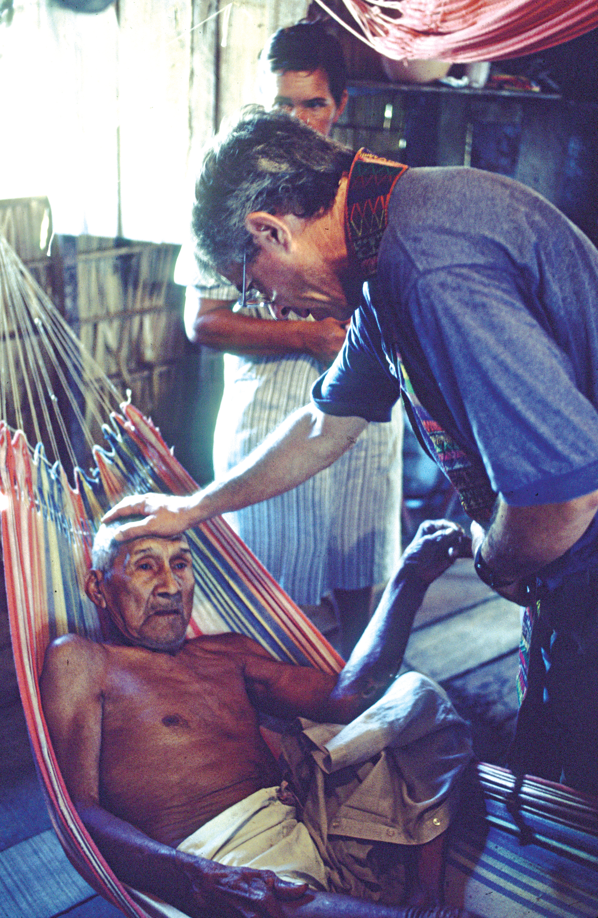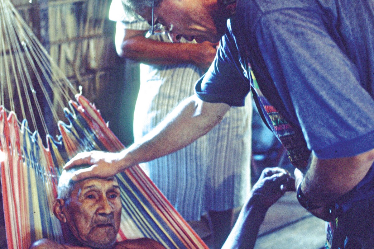 Scarboro missioner Bishop George Marskell ministers to a member of his parish. Itacoatiara, Brazil. Circa 1992
